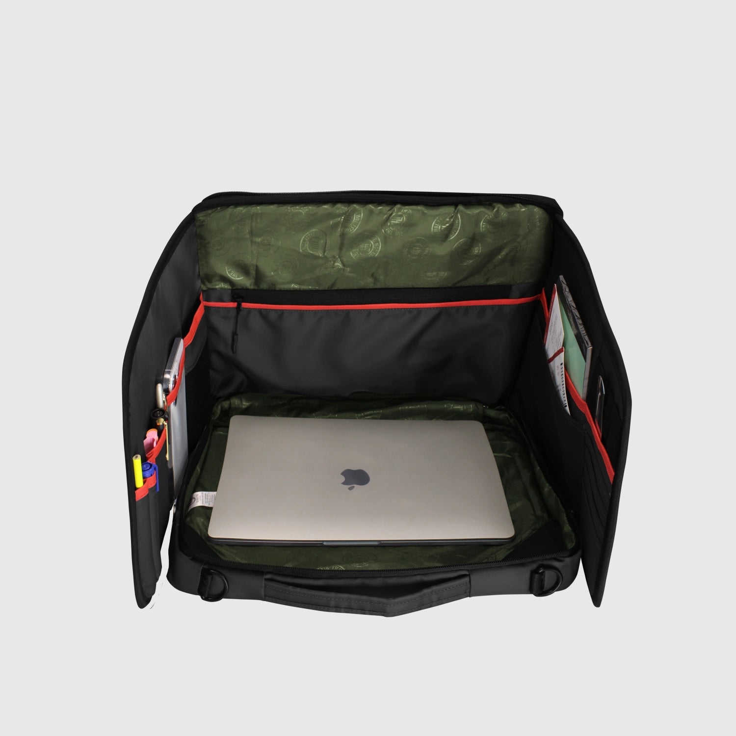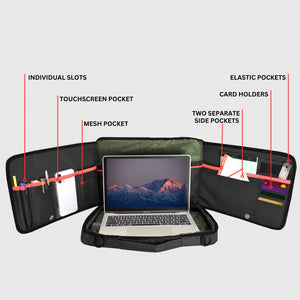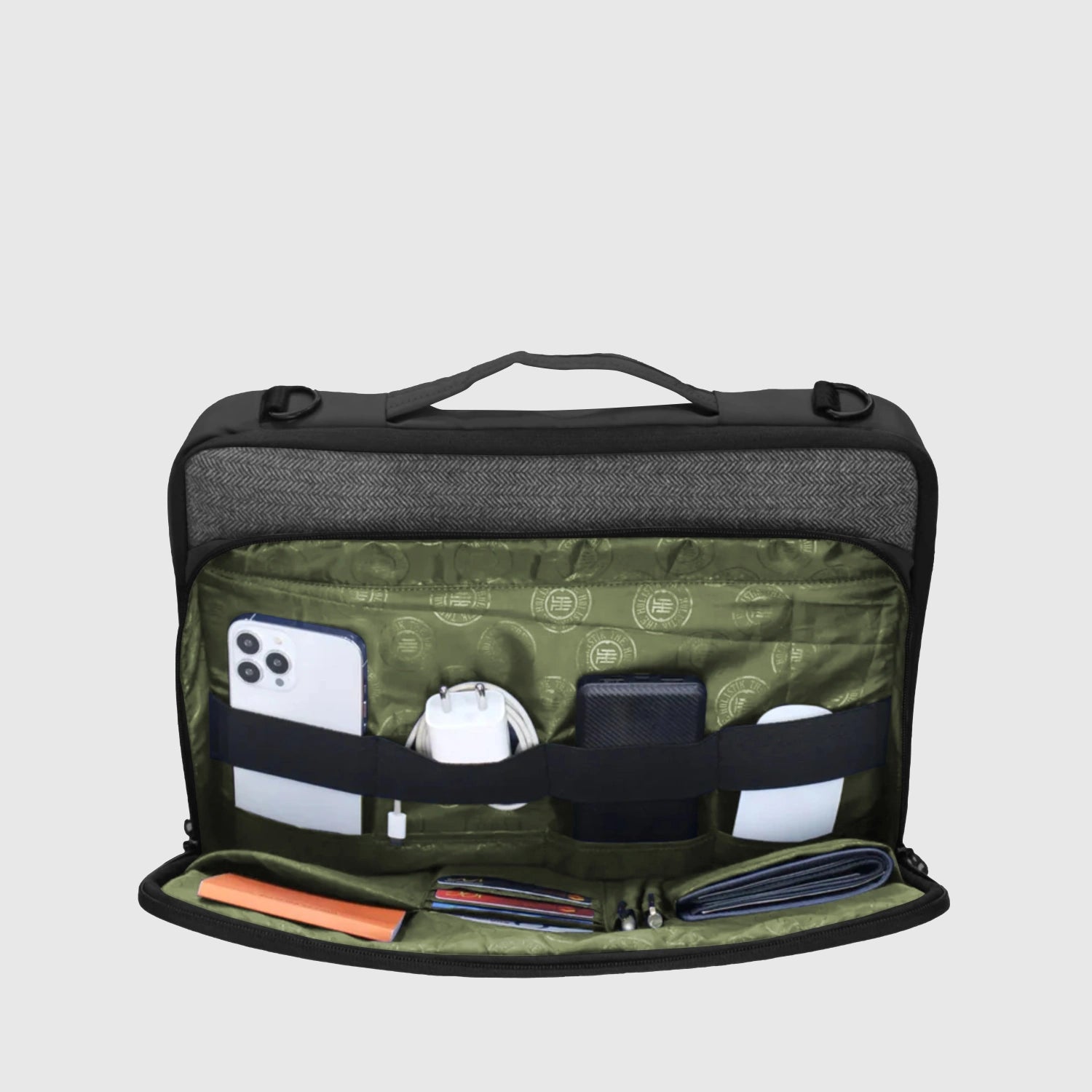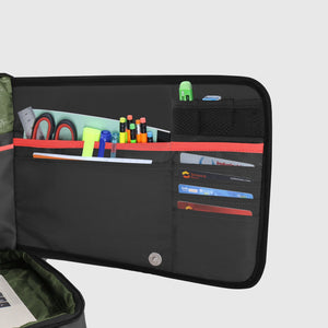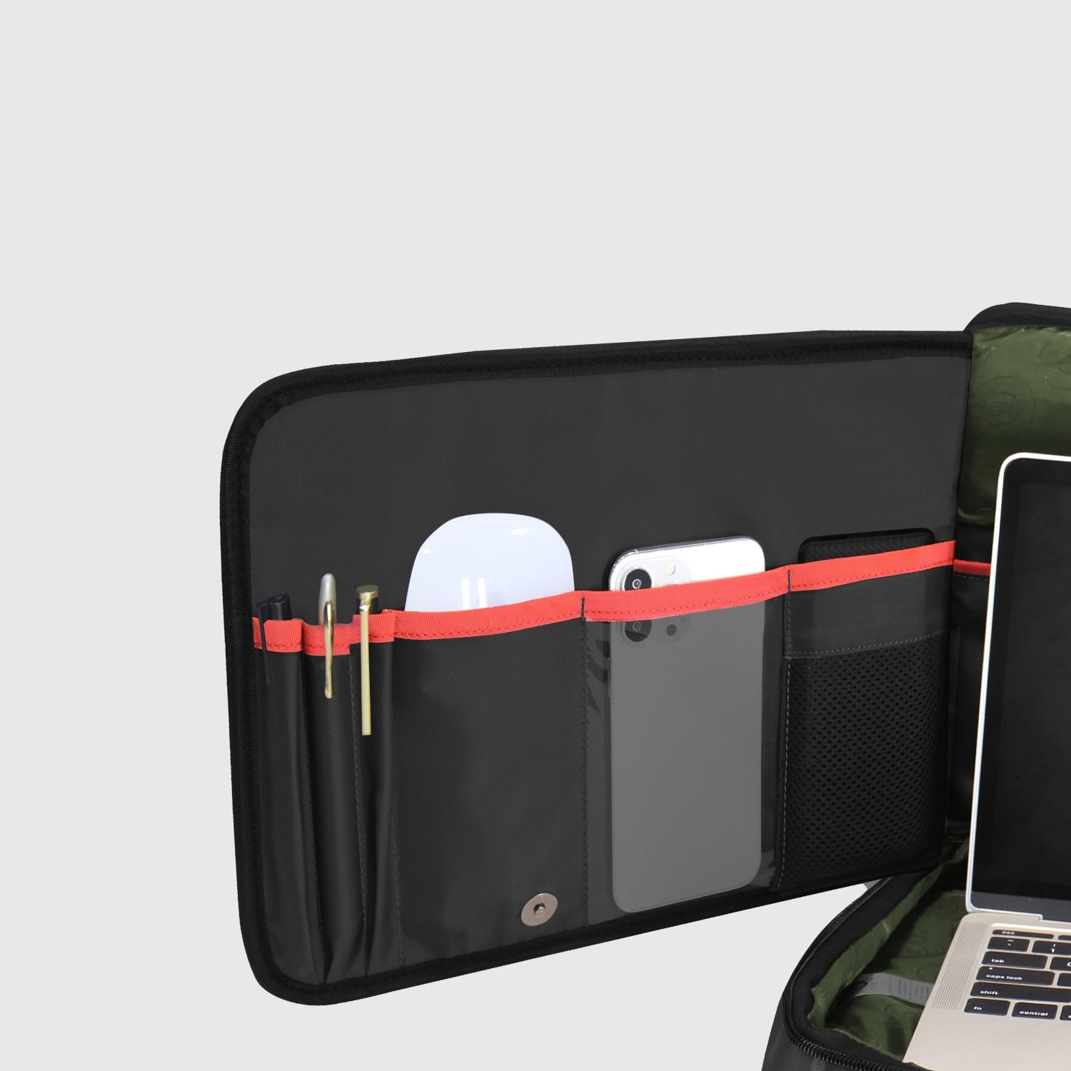 - Front Compartment: Dedicated slots for cards, ID, business cards, wires, chargers, USB drives, and small accessories for organized storage