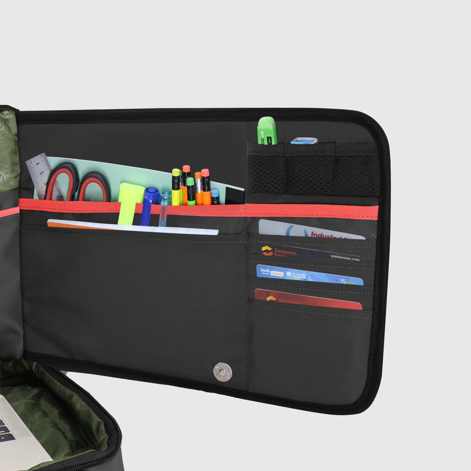 - Inner Pockets: Secure slot for cheque books, documents, and notes, keeping important papers organized and easily accessible. Transparent pocket for device protection from spills or dust, plus separate slots for pens, pencils, and highlighters