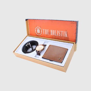Elegance II, The perfect combination of a man's watch, belt, and wallet makes an excellent gift regardless of the occasion. A thoughtful and practical choice that caters to the needs and preferences of a man. The watch is a functional timepiece and a stylish accessory that can complement any outfit. A man's belt is a practical and versatile accessory that not only serves a functional purpose but also adds a touch of style. The RFID-protected wallet provides a practical way to keep important items such as cash and cards organized.