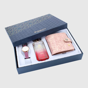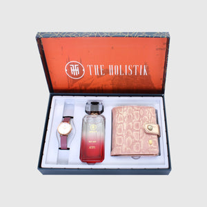 Fascination, Indulge in luxury with this premium collection of woman’s watch, EDP, and a wallet that is like a dream come true for every woman. Features an elegant and attractive watch, making it the perfect jewel for any occasion. The EDP is a tantalizing blend of floral and fruity scents, leaving a lasting impression wherever you go. And the RFID-protected woman`s wallet is crafted from high-quality faux leather, providing ample space for all your essentials while elevating your style game. A must-have for any woman who wants to make a statement.