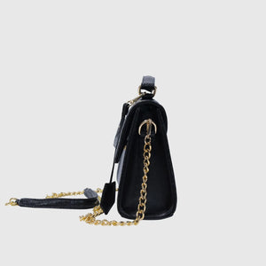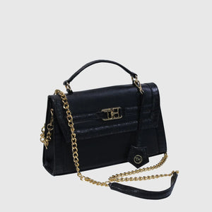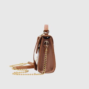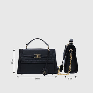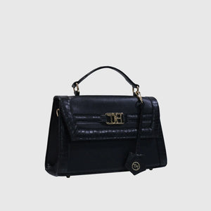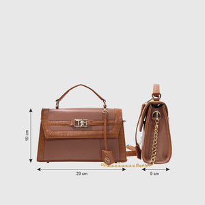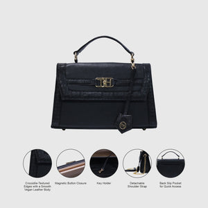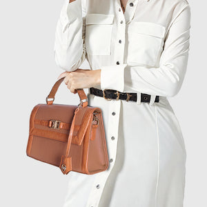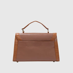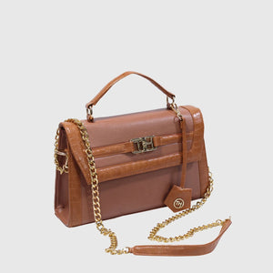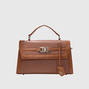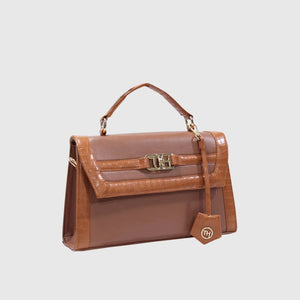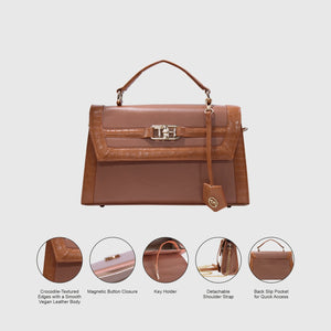 Introducing Melissa – a sophisticated and stylish handbag crafted from high-quality vegan leather. Designed with dual materials, it features a crocodile-textured pattern on the edges and smooth vegan leather on the main body, adding a touch of luxury with a sleek flap closure. The bag includes an elegant leather tag, an external pocket for easy access, and a spacious compartment for storage. Perfect for both formal and casual occasions. With a sturdy handle and a detachable strap, it offers versatility for hand-carry or shoulder wear. Available in Tan and Black.