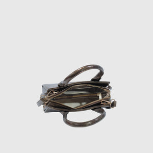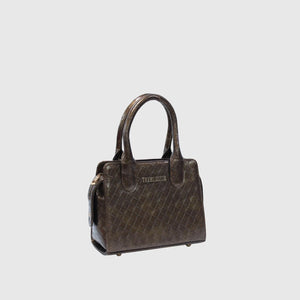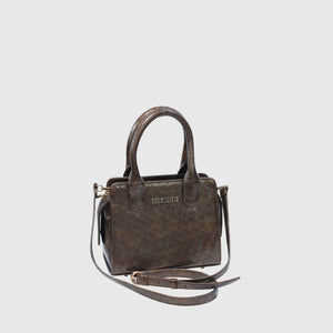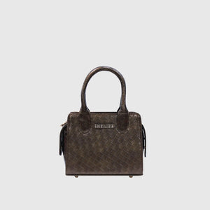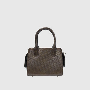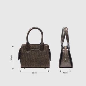 This stylish handbag features a woven leather pattern and a luxurious metallic finish, crafted from high-quality vegan leather with fine craftsmanship. Its structured design and sturdy handles add sophistication, while spacious compartments and zippered pockets provide ample storage. The adjustable shoulder strap enhances versatility, allowing it to be carried as a handbag or worn over the shoulder. Its elegant metallic tone complements various outfits, making it a must-have fashion accessory. Available in Walnut Brown.