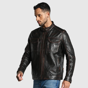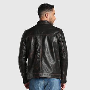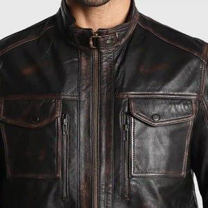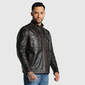 Experience the thrill of true craftsmanship with our 'Rugged' men's jacket made from genuine sheep rub off leather. Hand crafted dual tone finish screams vintage charm, this dark brown beauty is a nod to classic masculinity. The slim-fit cut accentuates your physique, while the genuine YKK zippers add a touch of modern sophistication. An inside lining zipper pockets keeps your valuables safe. With 'Rugged', you're not just wearing a jacket - you're donning a statement.