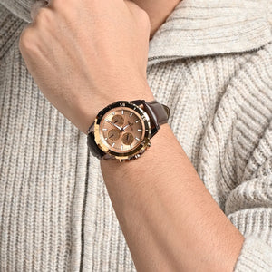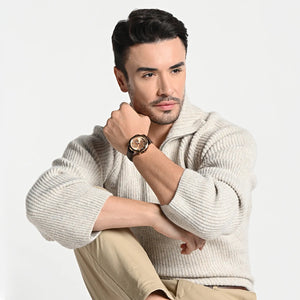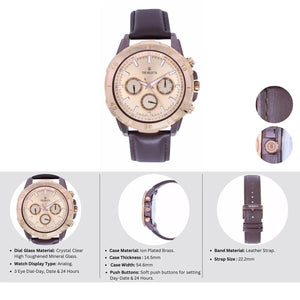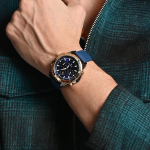 Zenith, A timepiece that makes you feel like a king. The rose gold or Blue colored dial adds class to its royal design. The bold design and multifunctional features make it the perfect accessory for any formal or casual occasion. The most versatile watch of today's generation. It is a perfect blend of style and utility. The watch is powered by a precise Japanese multifunction movement.